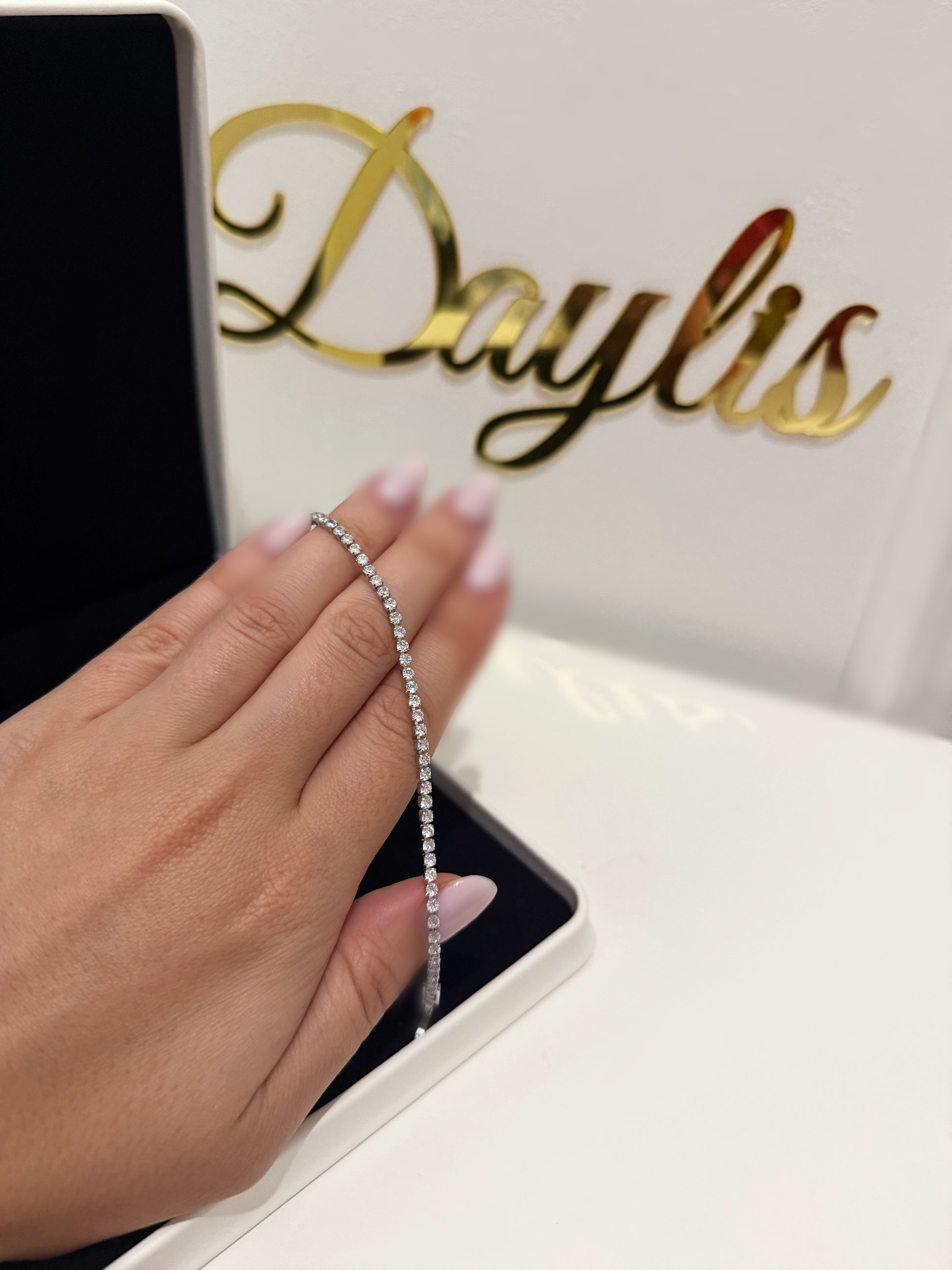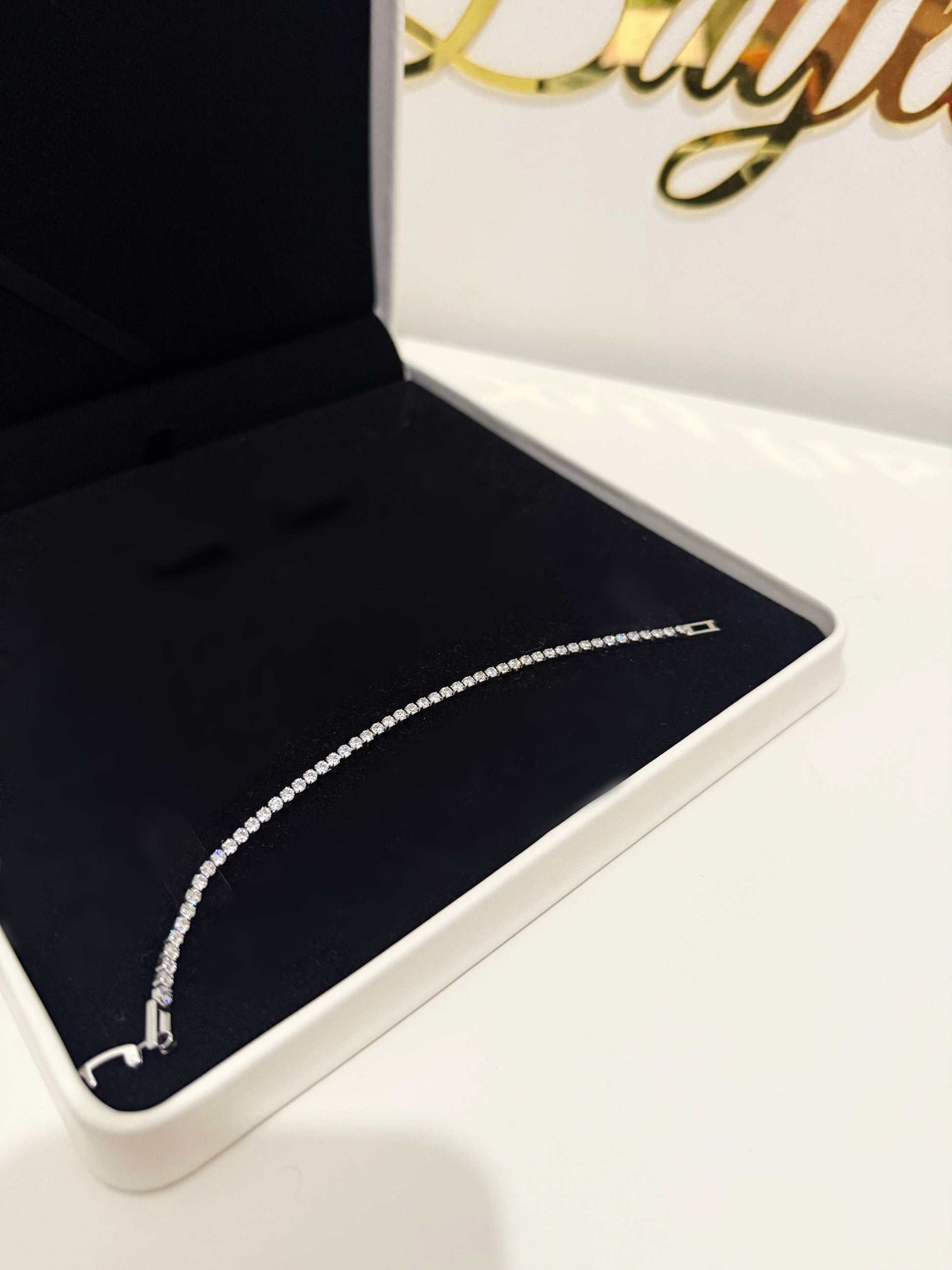 Rafinată și discretă, această brățară este alegerea perfectă pentru femeia care iubește eleganța atemporală. Realizată din cristale zirconiu de înaltă calitate și placată cu argint, strălucește delicat la fiecare mișcare a mâinii, adăugând un plus de feminitate și stil.