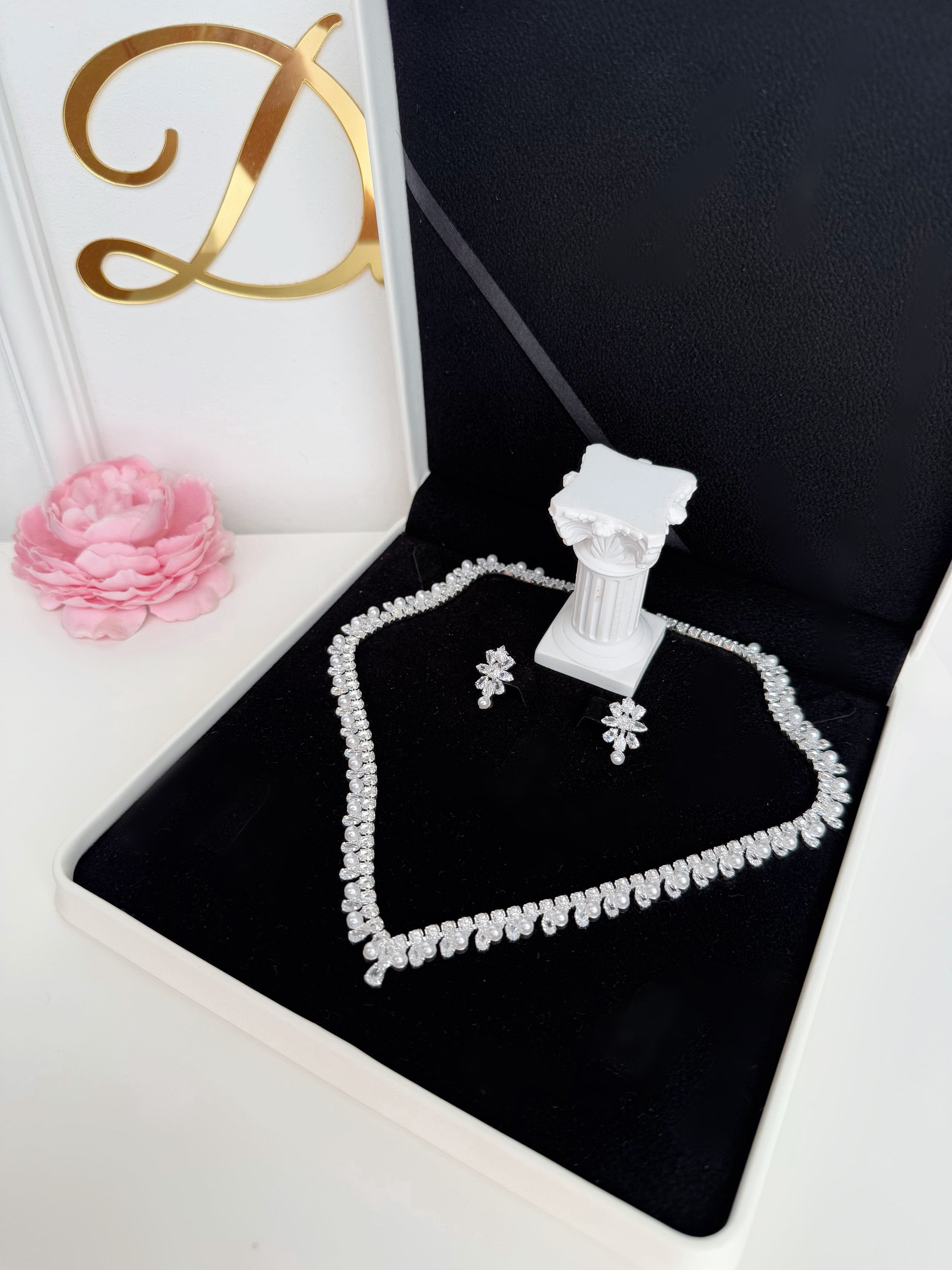 Inspirat de eleganța clasică și delicatețea iubirii adevărate, acest set este decorat cu perle fine și cristale strălucitoare, ce oferă un plus de rafinament și feminitate.